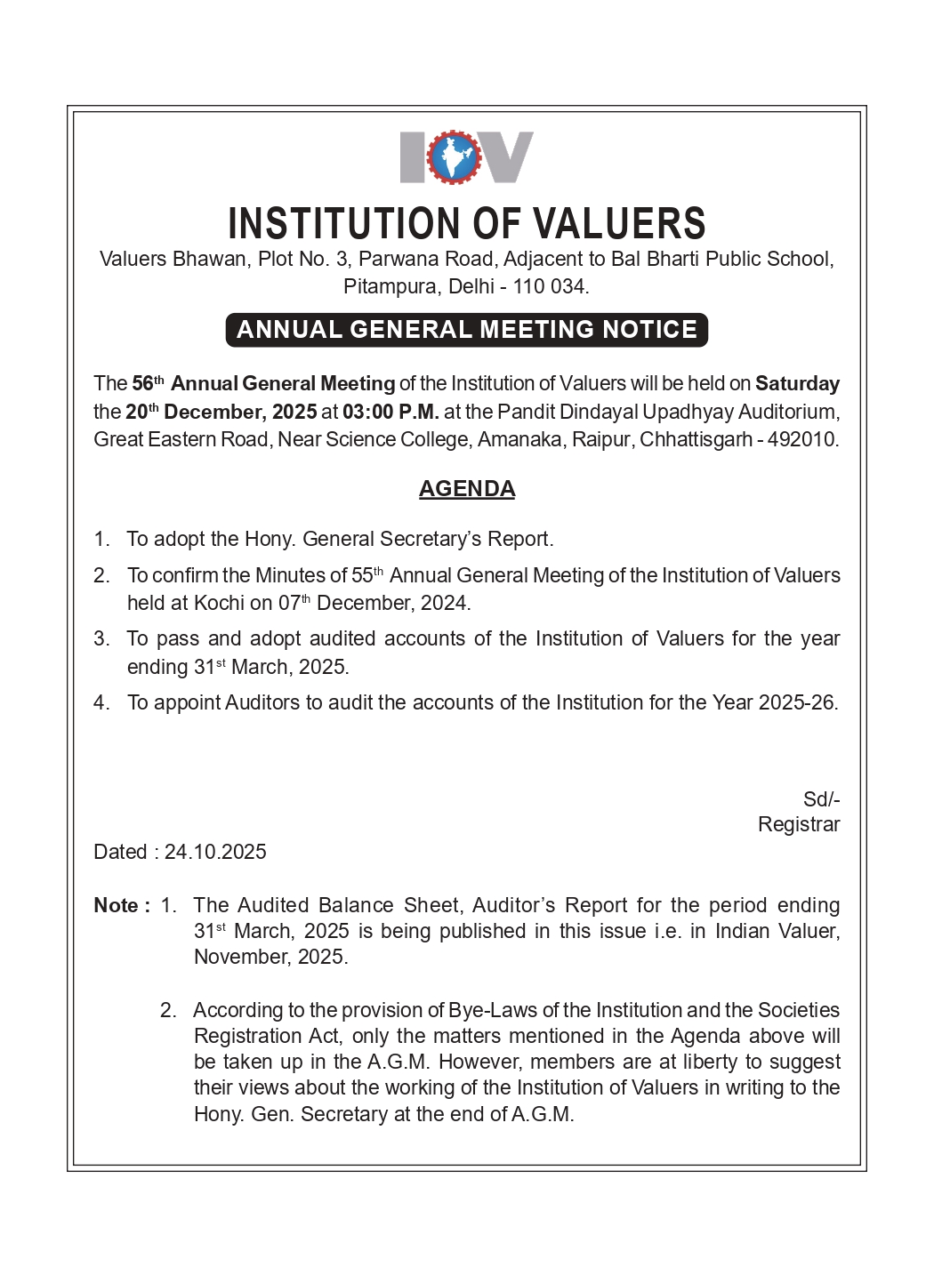 56th Annual General Meeting of IOV will be held on Saturday the 20th Dec, 2025 at 3:00 PM at the Pandit Dindayal Upadhyay Auditorium, Great Eastern Road, Near Science College, Amanaka, Raipur, Chhattisgarh - 492010