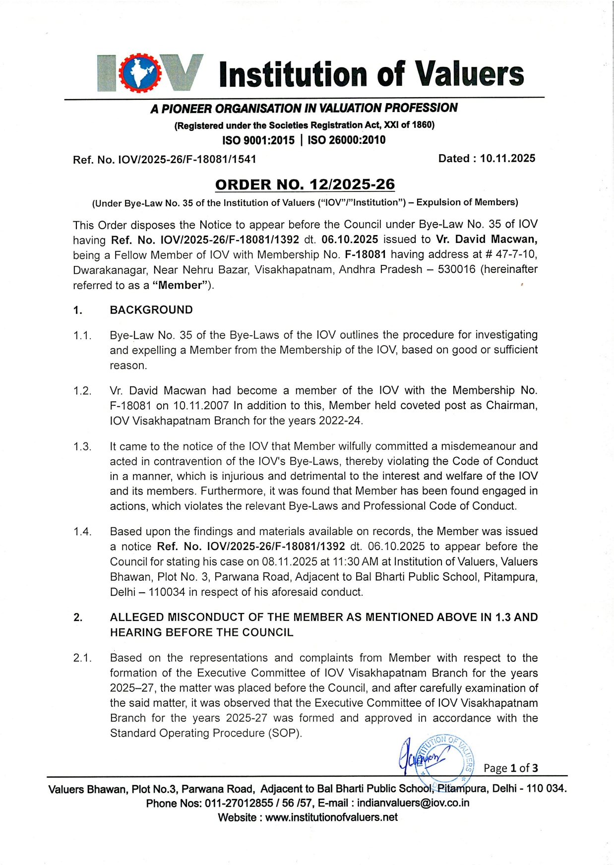 This Order disposes the Notice to appear before the Council under Bye-Law No. 35 of IOV having Ref. No. IOV/2025-26/F-18081/1392 dt. 06.10.2025 issued to Vr. David Macwan,